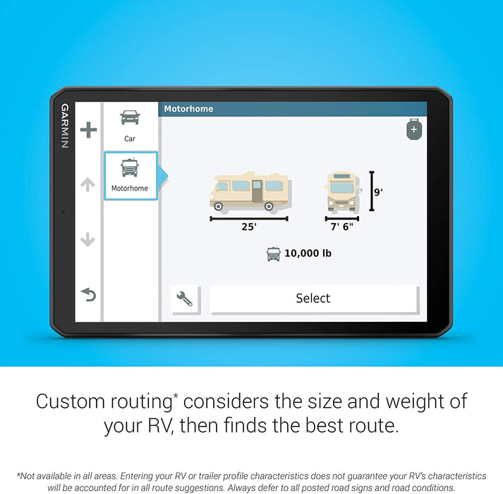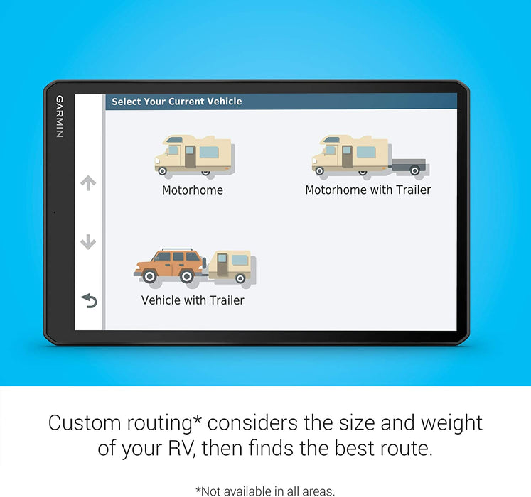 - Custom routing considers the size and weight of your RV then finds the best route (not available in all areas)