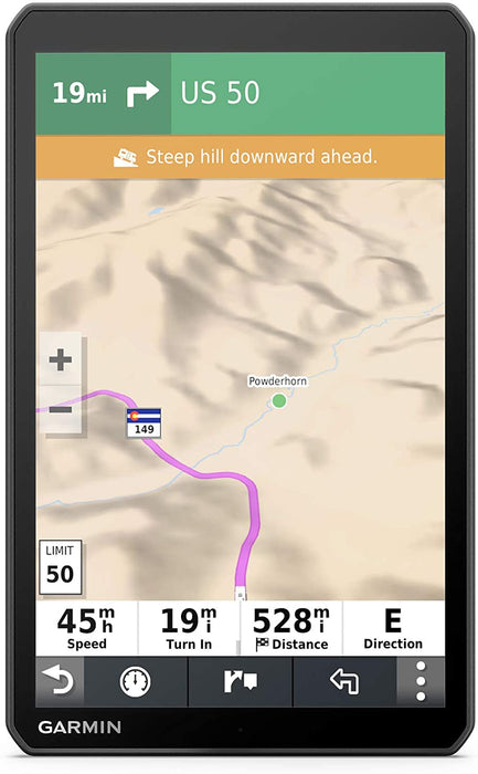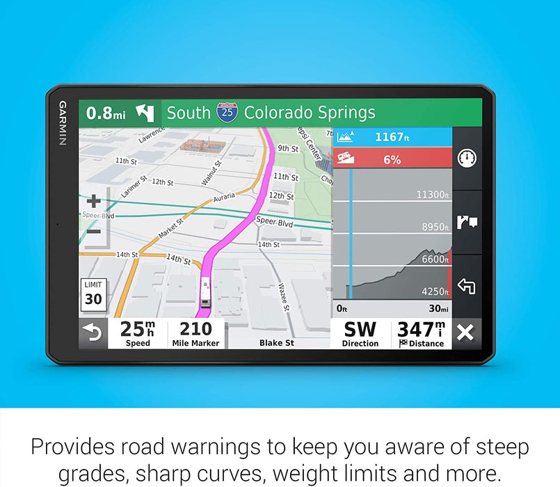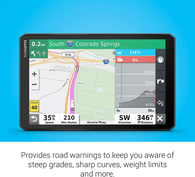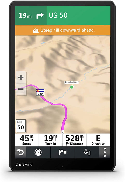 - Provides road warnings to keep you aware of steep grades, sharp curves, weight limits and more
