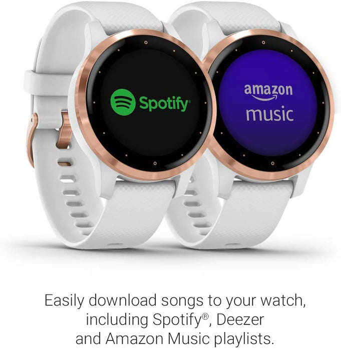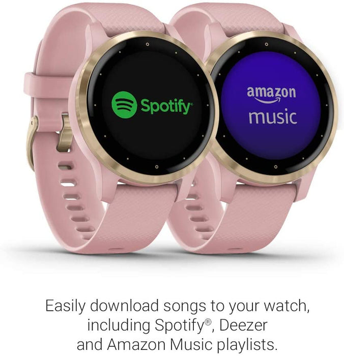 - Easily download songs to your watch, including playlists from Spotify, Amazon music or Deezer (may require a premium subscription with a third party music provider), and connect with headphones (sold separately) for phone free listening