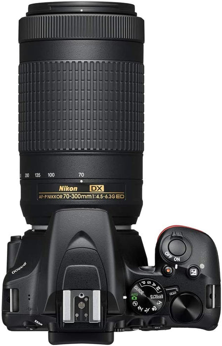 - CAMERA INCLUDES: Nikon D3500 DSLR Interchangeable Lens Camera Body | AF-P DX NIKKOR 18-55mm f/3.5-5.6G VR Lens | AF-P DX NIKKOR 70-300mm f/4.5-6.3G ED Lens | Lens Caps | EN-EL14a Rechargeable Li-ion Battery | MH-24 Quick Charger | AN-DC3 Strap | BF-1B Body Cap | DK-25 Rubber Eyecup | Nikon USA Authorized Dealer Warranty