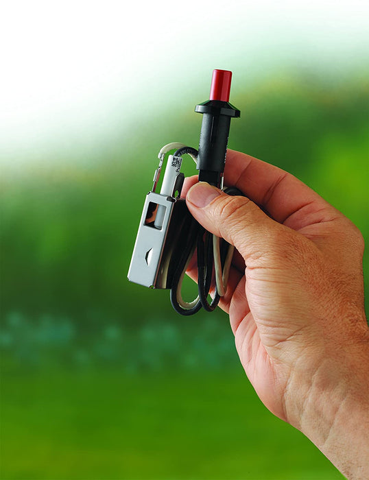 - Kit includes: push-button igniter, gas-catcher ignition chamber, white wire, black wire, and instruction sheet