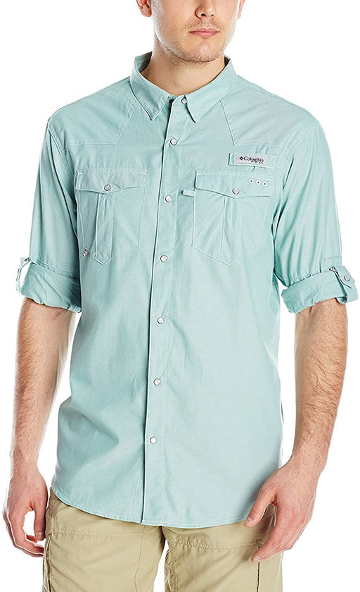 ColumbiaBasket Chambray 100% cotton Imported Machine Wash Omni-SHADE UPF 30 sun protection Roll-up sleeves with tab holders & Pearl Snaps Rod holder &...
