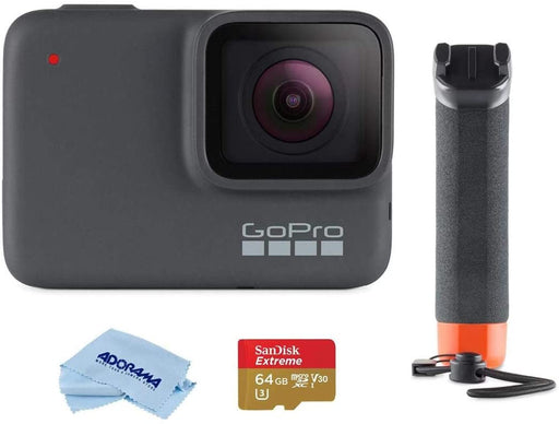 GoPro HERO7 Silver - Waterproof Digital Sports and Action Camera with Touch Screen 4K HD Video 10MP Photos, Bundle with Floating Hand Grip, 2 Extra Batteries + 64GB microSD Card + Cleaning Cloth