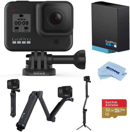 GoPro HERO8 Black, Waterproof Action Camera with Touch Screen 4K UHD Video 12MP Photos, Selfie Stick Bundle with GoPro 3-Way 3-in-1 Mount, Battery, 32GB microSD Card, Microfiber Cloth