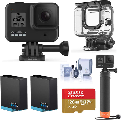 GoPro HERO8 Black, Waterproof Action Camera with Touch Screen 4K UHD Video 12MP Photos, Water Adventure Bundle with Dive/Protective Case, Hand Grip, 2 Battery, 128B microSD Card, Cleaning Kit