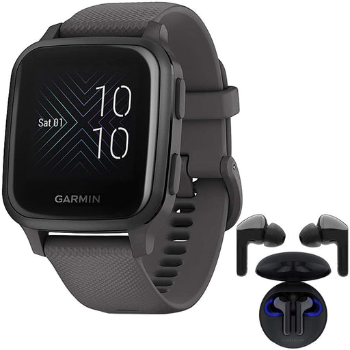 Garmin 010-02427-00 Venu Sq, Slate Aluminum Bezel with Shadow Gray Case and Silicone Bundle with LG Tone Free HBS-FN6 True Wireless Earbuds Bluetooth Meridian Audio w/UVnano Case