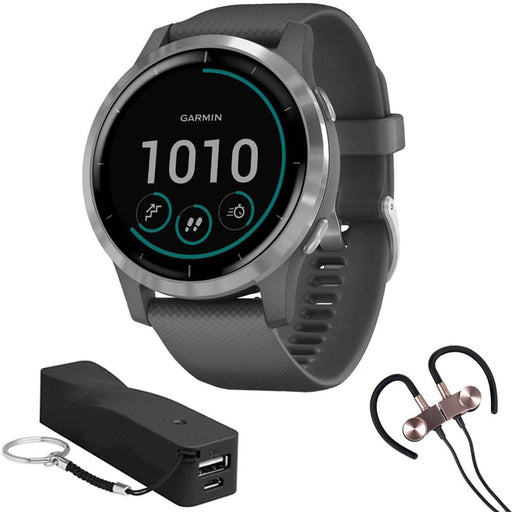 Garmin 010-02174-01 Vivoactive 4 Smartwatch (Shadow Gray/Stainless) Bundle with Voltix 2600mAh Portable Power Bank and Deco Gear Magnetic Wireless Sport Earbuds