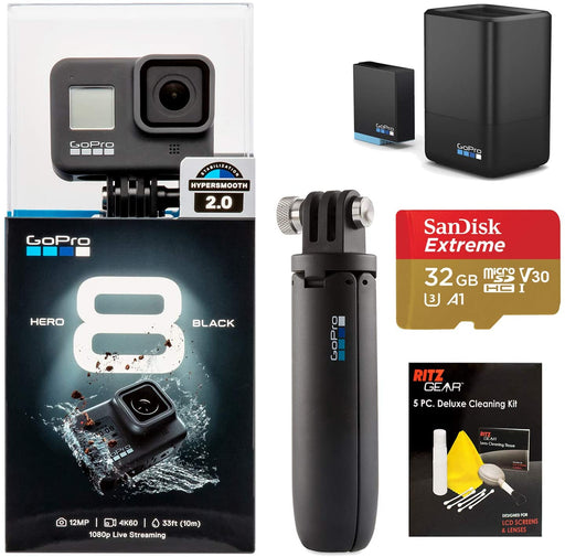 GoPro Hero 8 Black Action Camera + GoPro Dual Battery Charger with Extra Original Battery (HERO8 Black) + Gopro Shorty Tripod + 32GB U3 Memory Card + Ritz Gear 5 Piece Cleaning Kit