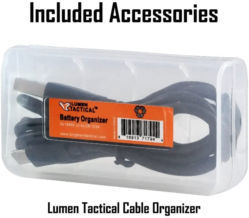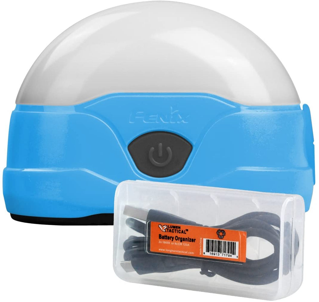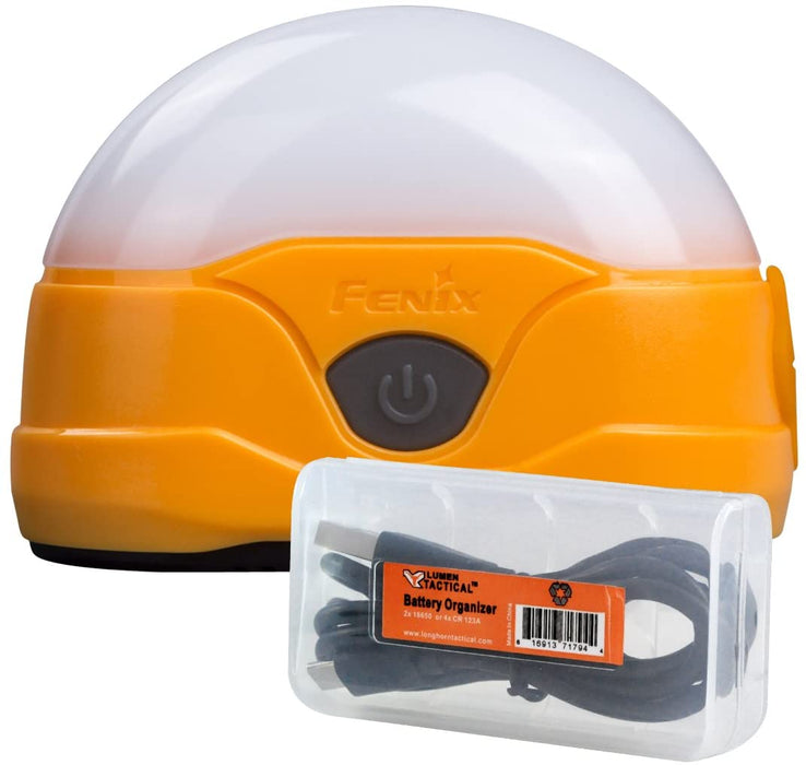 - PACKAGE CONTENTS - Fenix CL20R Camping Lantern, USB Charging Cable, User Manual, Warranty Card, Lumen Tactical Charging Cable and Lumen Tactical Cable/Battery Organizer