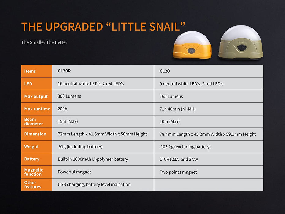 - BRIGHT, COMPACT CAMPING LANTERN - The CL20R is a compact and brighter upgrade to the CL20! Providing smooth lighting 360 degrees of illumination, this upgraded version houses a brighter LED that produces 300 lumens and has a max runtime of 200 hours making it twice as bright and runs twice as long.