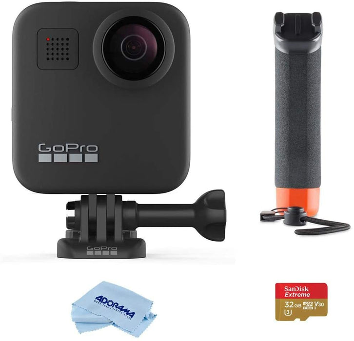 • KIT INCLUDES: GoPro MAX 360 Action Camera (CHDHZ-201) | Rechargeable Battery | Curved Adhesive Mount | 2x Protective Lenses | 2x Lens Caps | Microfiber Bag | Mounting Buckle + Thumb Screw | USB-C Cable | GoPro Floating Hand Grip (The Handler GOAFHGM001) | SanDisk 32GB Extreme microSDHC Class 10 U3 Memory Card | Microfiber Cleaning Cloth