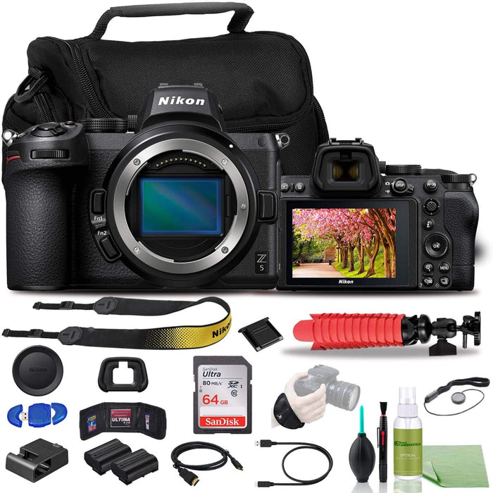 - NIKON AUTHORIZED DEALER - Includes Full NIKON USA WARRANTY - Bundle Includes: 1 x Nikon Z 5 Mirrorless Digital Camera (Body Only) | 1 x Lithium Ion Rechargeable EN-EL15 Battery | 1 x SanDisk 64GB Ultra SDXC UHS-I Memory Card | 1 x Soft Padded Carrying Case | 1 x Premium Flexible Tripod | 1 x Cleaning Kit | 1 x Hand Strap | 1 x Mini HDMI to HDMI High Performance Cable | 1 x Memory Card Wallet | 1 x SD Card USB Reader | 1 x Lens Cap Keeper