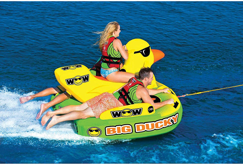 - 1-3 PERSON TOWABLE: This custom, deluxe towable tube features a WOW Big Ducky design theme, secure saddle seat as well as a large, wing-shaped deck area for 1,2, or 3 riders to sit, stand, kneel or lay down.
