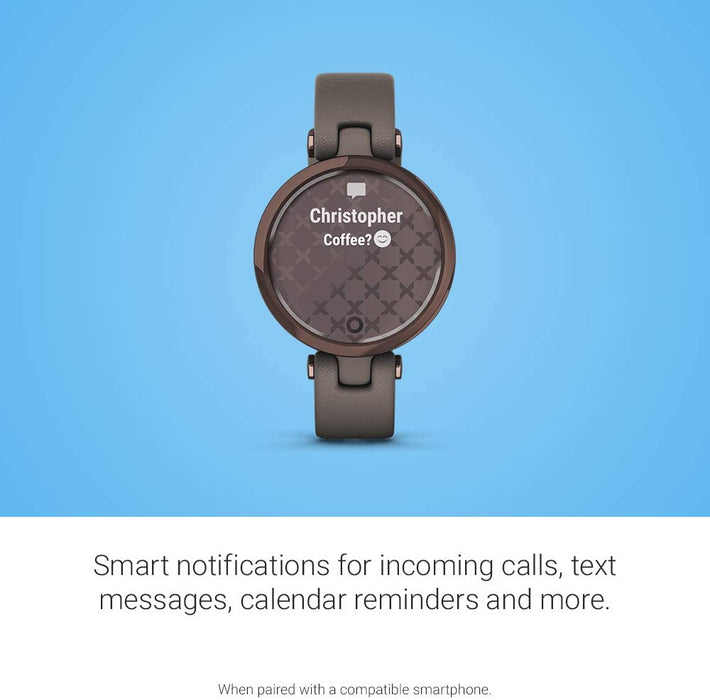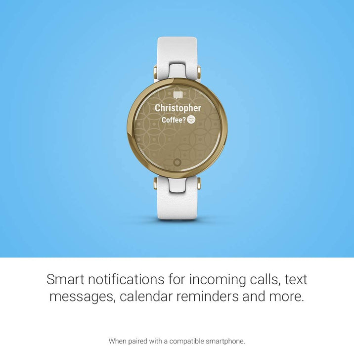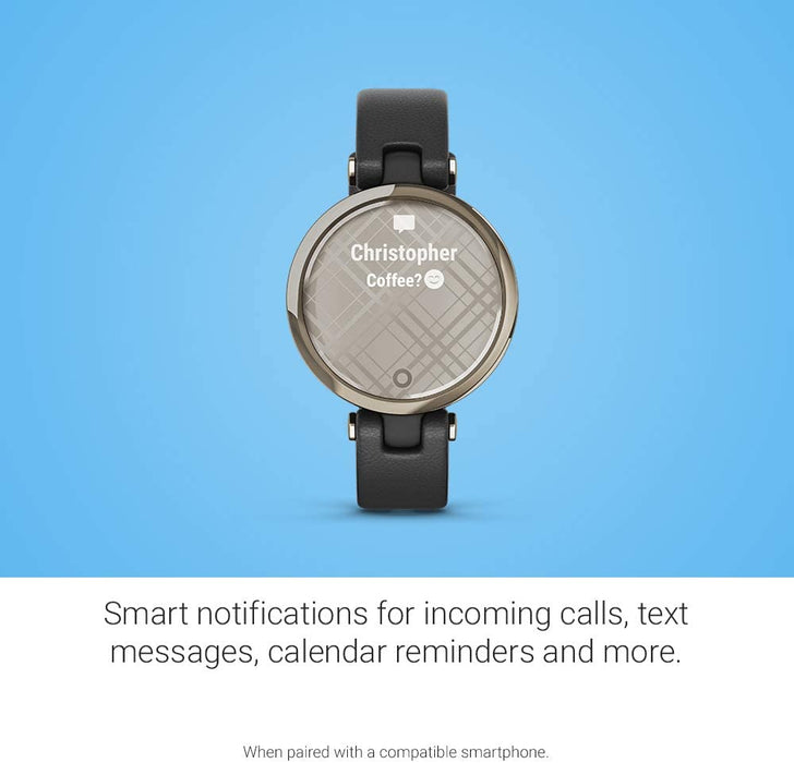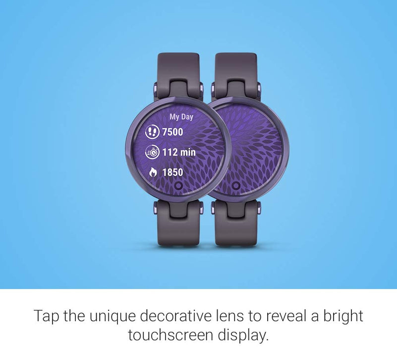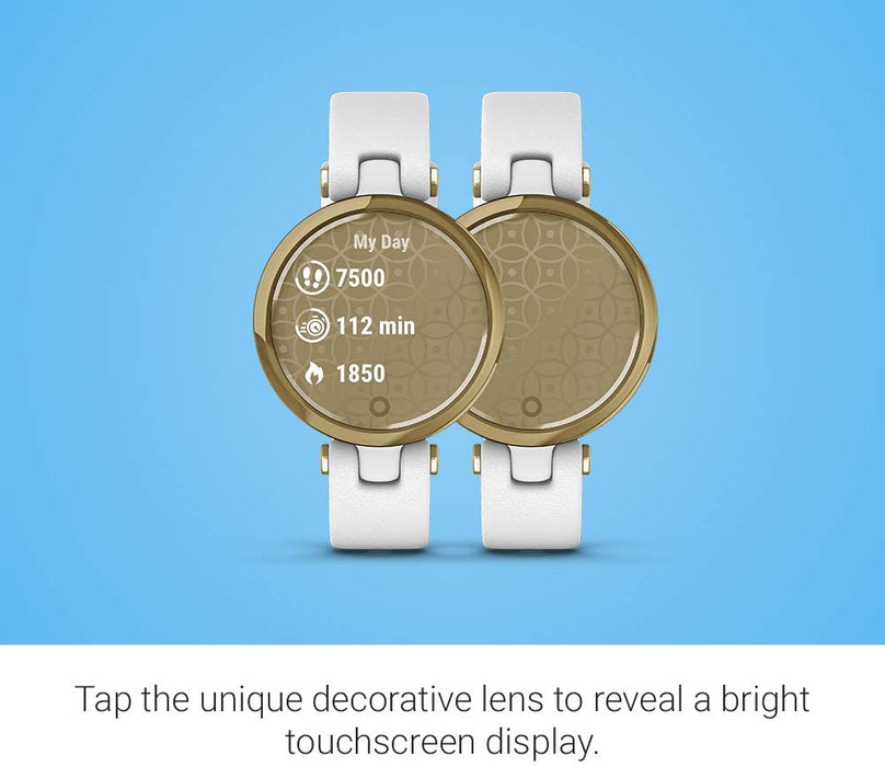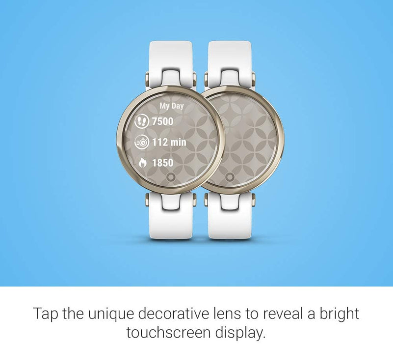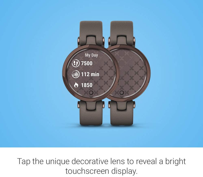 • Small stylish smartwatch complements your look with a unique decorative lens that reveals a bright touchscreen display with a tap