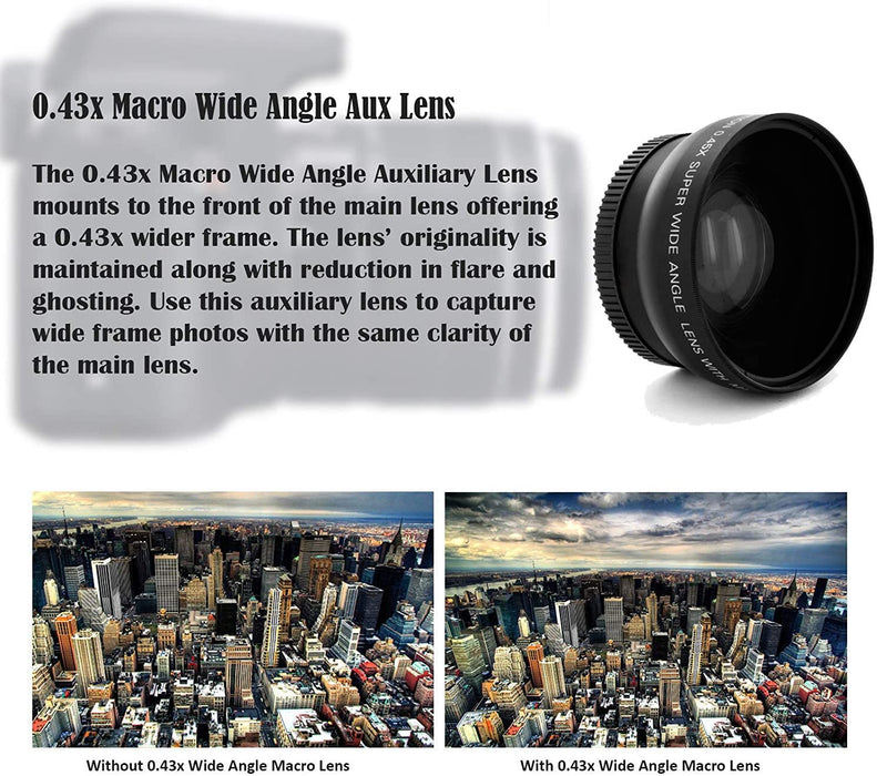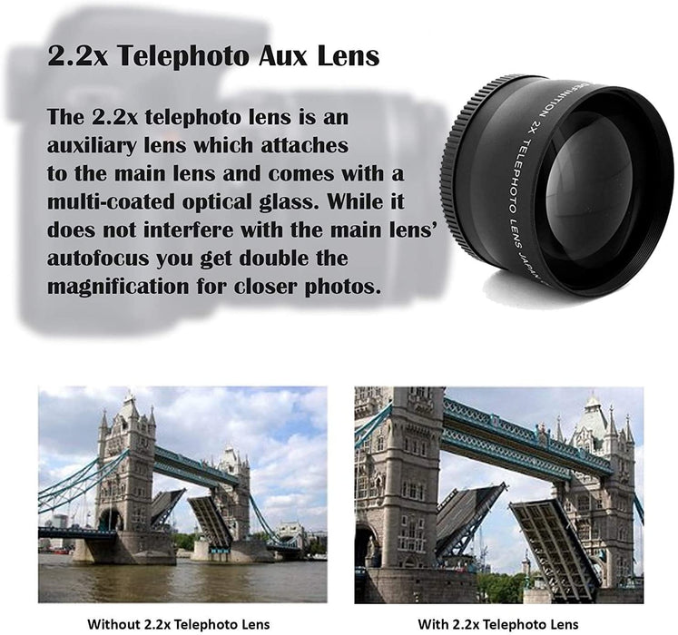 - 50" Tripod (black), 58mm 2.2x Telephoto & 58mm 0.43 Wide Angle Lens Attachment, Lens Cap Keeper, 5-Piece Cleaning Kit