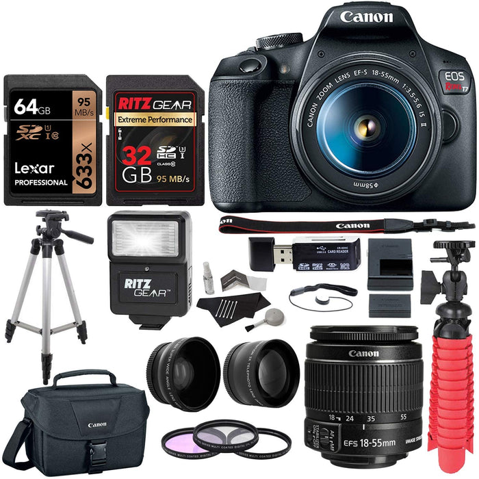Canon EOS Rebel T7 24MP Camera with EF-S 18-55mm is II Lens, 2 Memory Cards, Slave Flash, 50" Tripod, Camera Bag, Cleaning Kit and Memory Card Reader/Writer Bundle