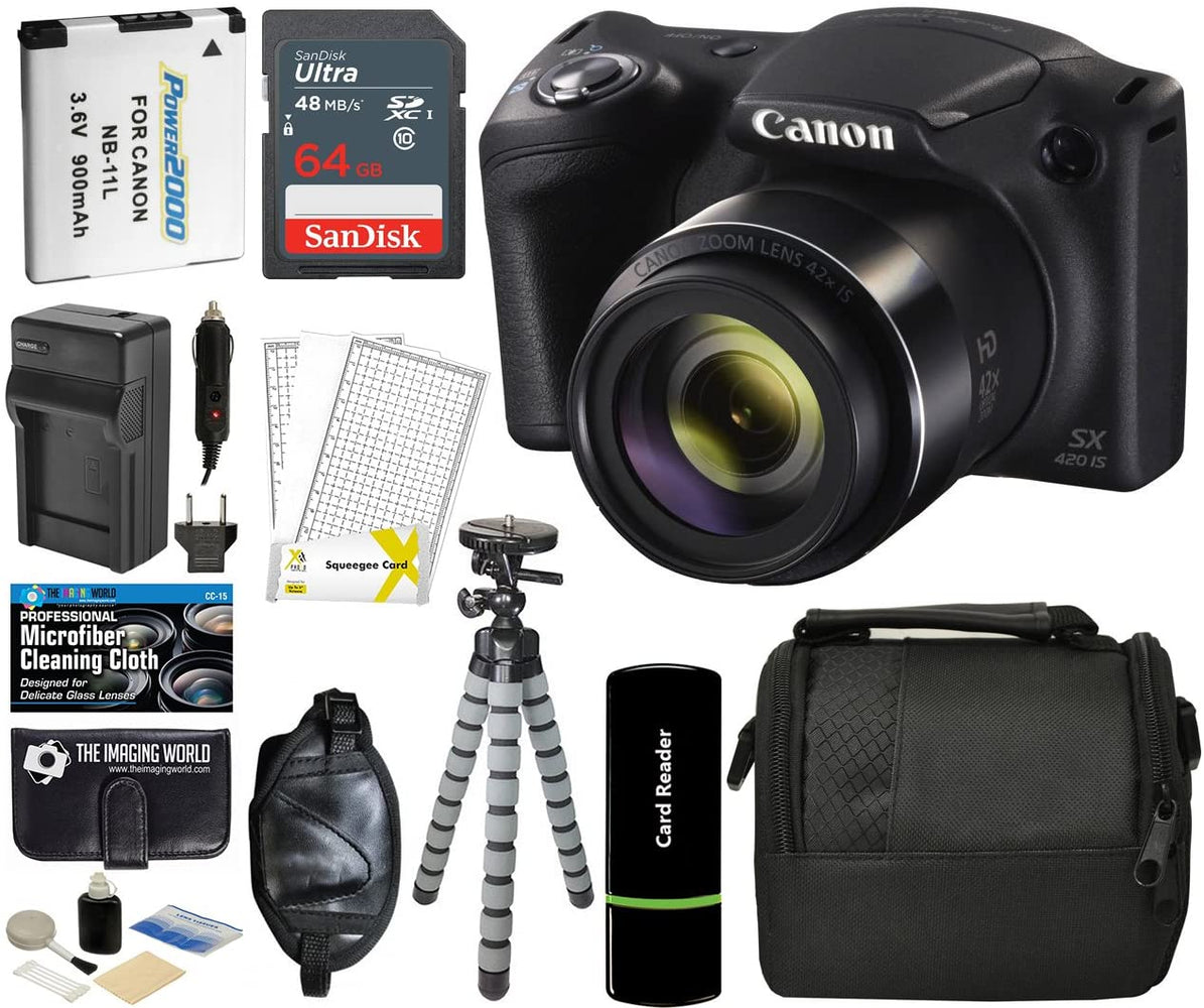 Canon PowerShot SX420 IS Digital Camera (Black) with 20MP, 42x Optical Zoom, 720p HD Video & Built-In Wi-Fi + 64GB Card + Reader + Grip + Spare Battery and Charger + Tripod + Complete Accessory Bundle