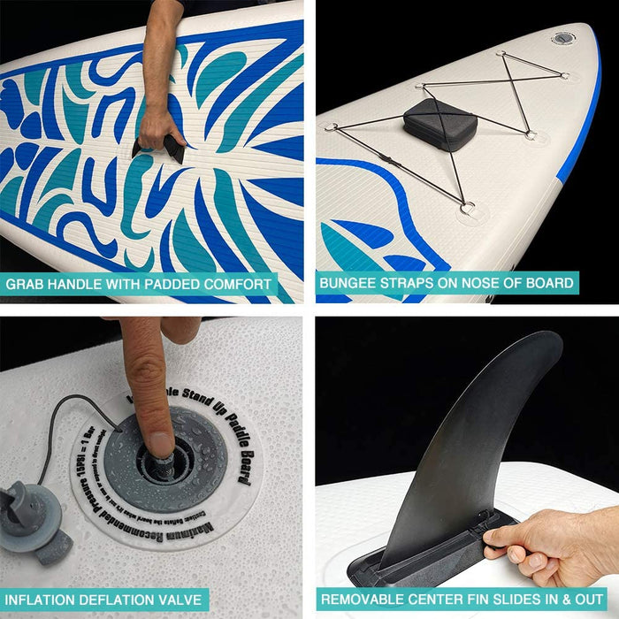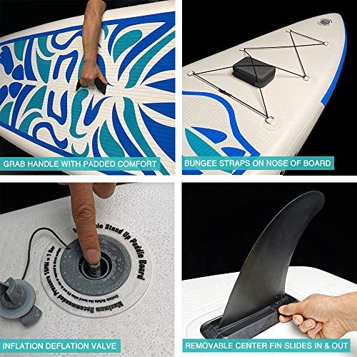 - 【Package including 】 Board, adjustable aluminum paddle, high pressure pump, travel backpack, coil leash,waterproof bag, and 3 removable fins.