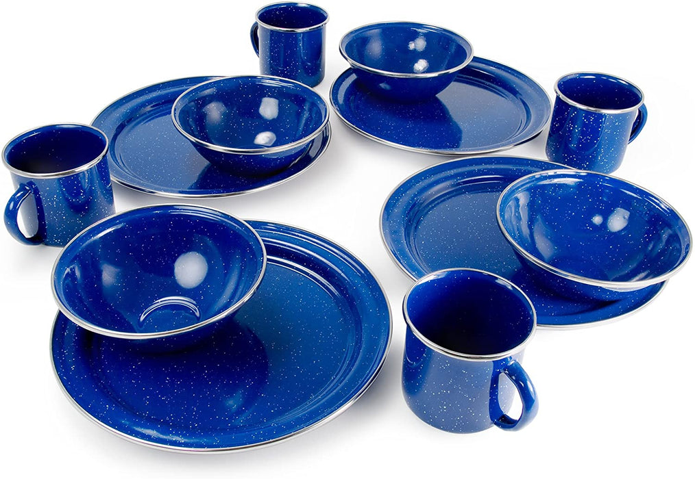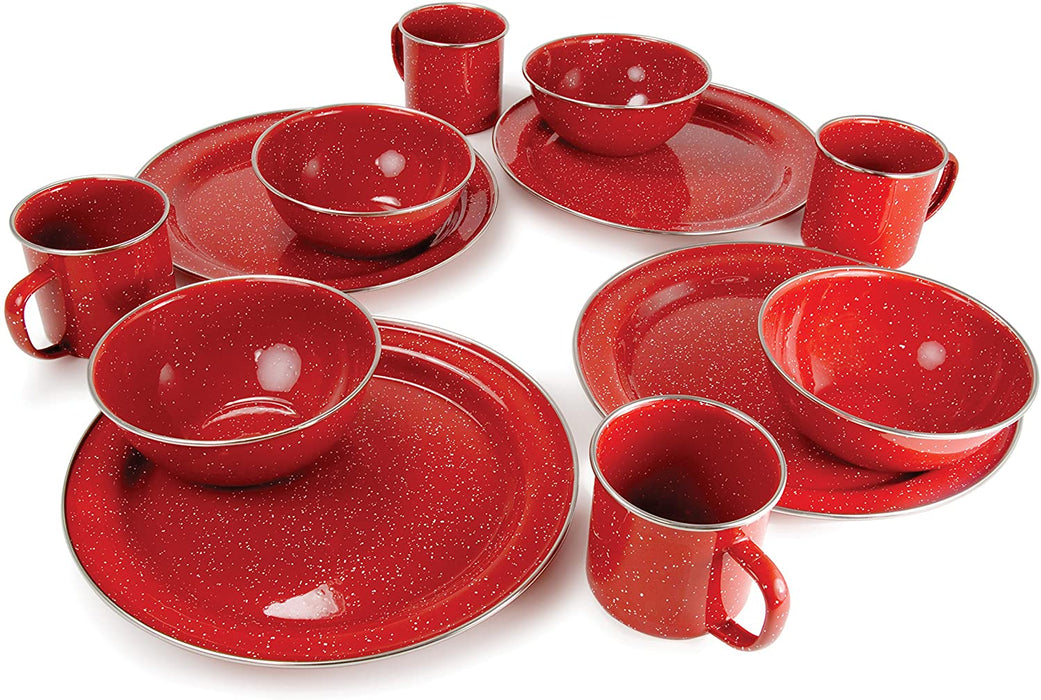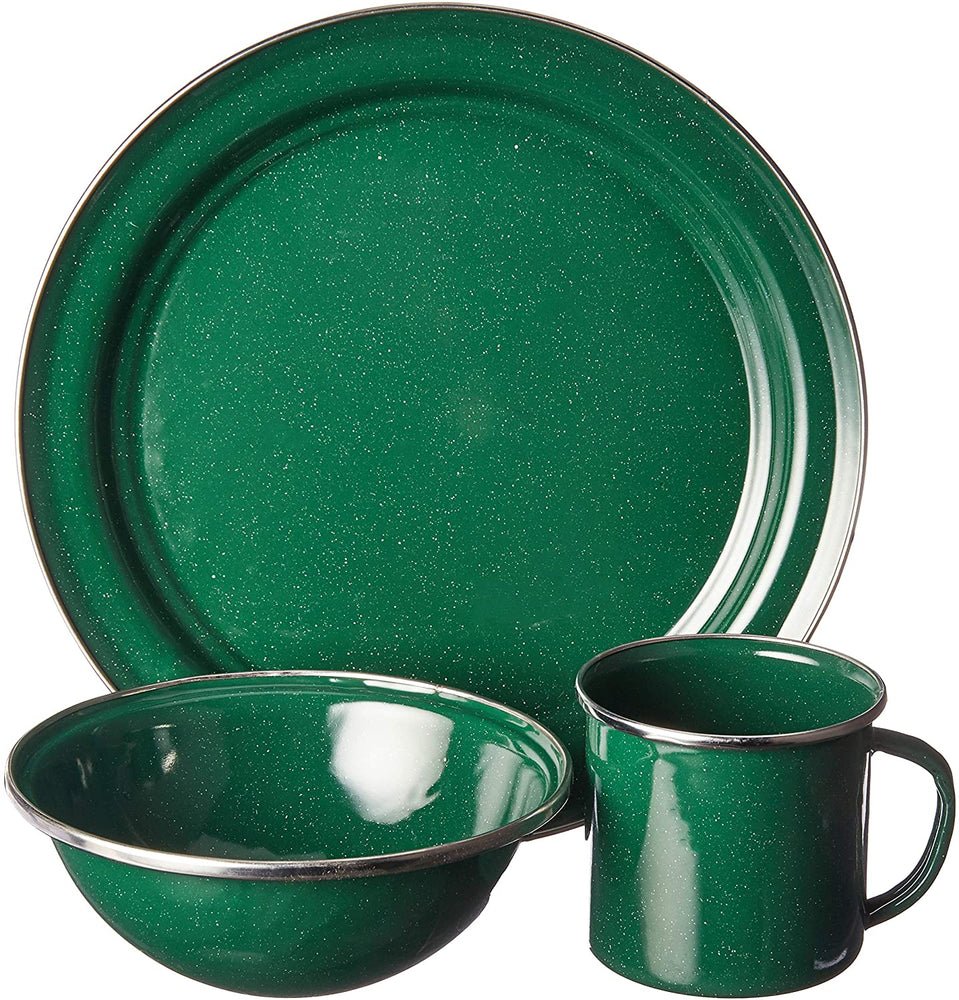 - FEAST IN THE FOREST: Featuring four 12-ounce cups, four 10. 375-inch plates, and four 5. 75-inch bowls, the Pioneer Table Set is a necessity for all your outdoor dining experiences