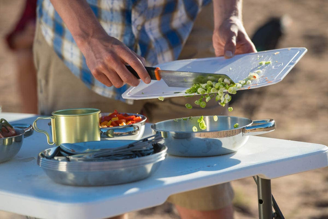 - Compact, stainless steel blade perfectly rockered for kitchen prep and any other camp use