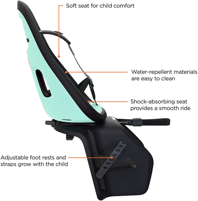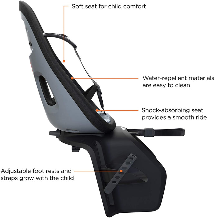 • Lightweight rear-rack-mounted child bike seat with a contemporary design and premium child comfort