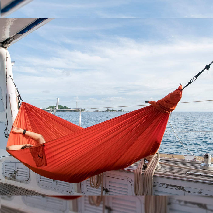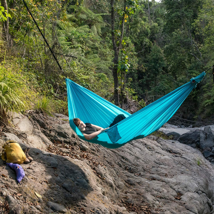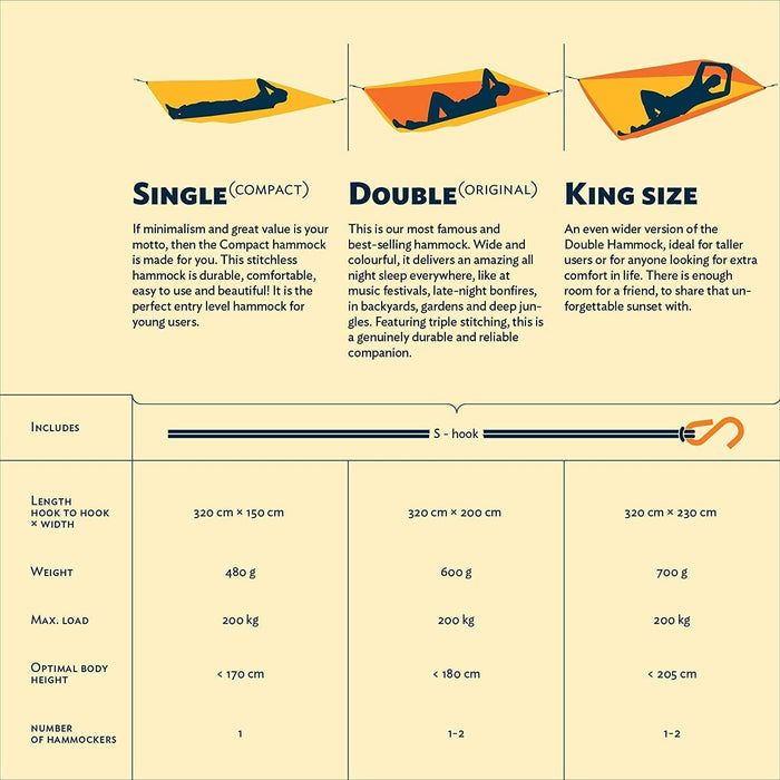 • MINIMALIST AND LIGHTWEIGHT - FITS IN EVERY BAG - If minimalism and great value is your motto, then the Compact hammock is made for you. This travel bed is durable, comfortable, easy to use, and beautiful! It is the perfect entry-level hammock for young users. 3.2 * 1.55m, only 480g, incl. S-hooks recommended suspension: TTTM Lightest Strap.